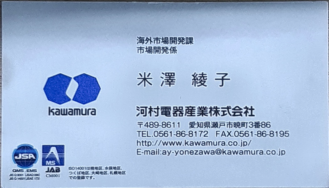? Địa chỉ: ? Công ty: 河村電器産業株式会社, ISO14001は現地区、水地区、, つくば地区、大崎地区、札幌地区, での登録です。, 海外市場開発課, 開発, 米澤 綾子, 河村電器産業株式会社, 〒489-8611 愛知県瀬戸市暁町3番86