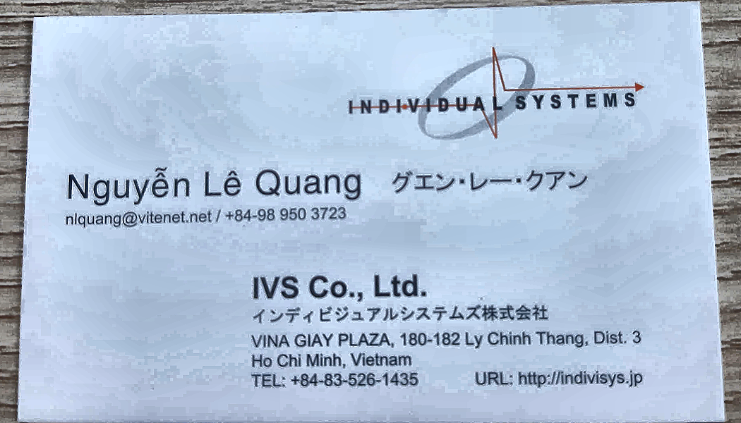 | 201 | Họ tên: : Chức vụ: Công ty: IVS Co., Email: nlquang@vitenet.net Số điện thoại: +84989503723 Website: http://indivisys.jp Mã số thuế: Địa chỉ: Ho Chi Minh, Vietnam, TEL: +84-83-526-1435, URL: http://indivisys.jp | Holland / Business / Manufacturing & Trading | 2025-10-23 09:24:36 | Khách | |||