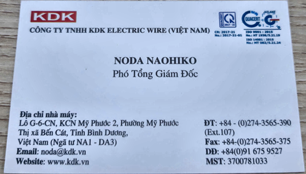 | 212 | Họ tên: : Chức vụ: Công ty: CÔNG TY TNHH KDK ELECTRIC WIRE VIỆT NAM Email: noda@kdk.vn Số điện thoại: Website: www.kdk.vn Mã số thuế: 3700781033 Địa chỉ: nhà máy:, Lỗ G-6-CN, KCN Mỹ Phước 2, Phường Mỹ Phước, Thị xã Bến Cát, Tỉnh Bình Dương,, Việt Nam (Ngã tư NAM - DA3) | Thailand / Business | 2025-10-22 01:32:21 | Khách | |||