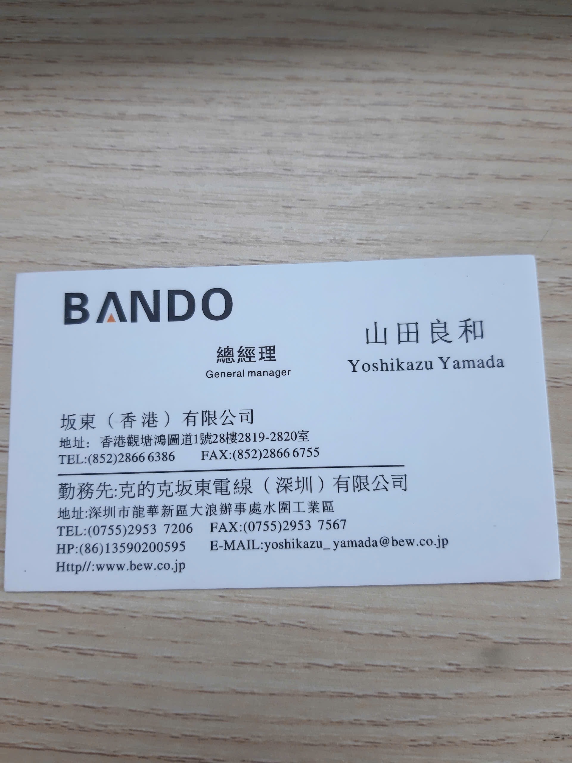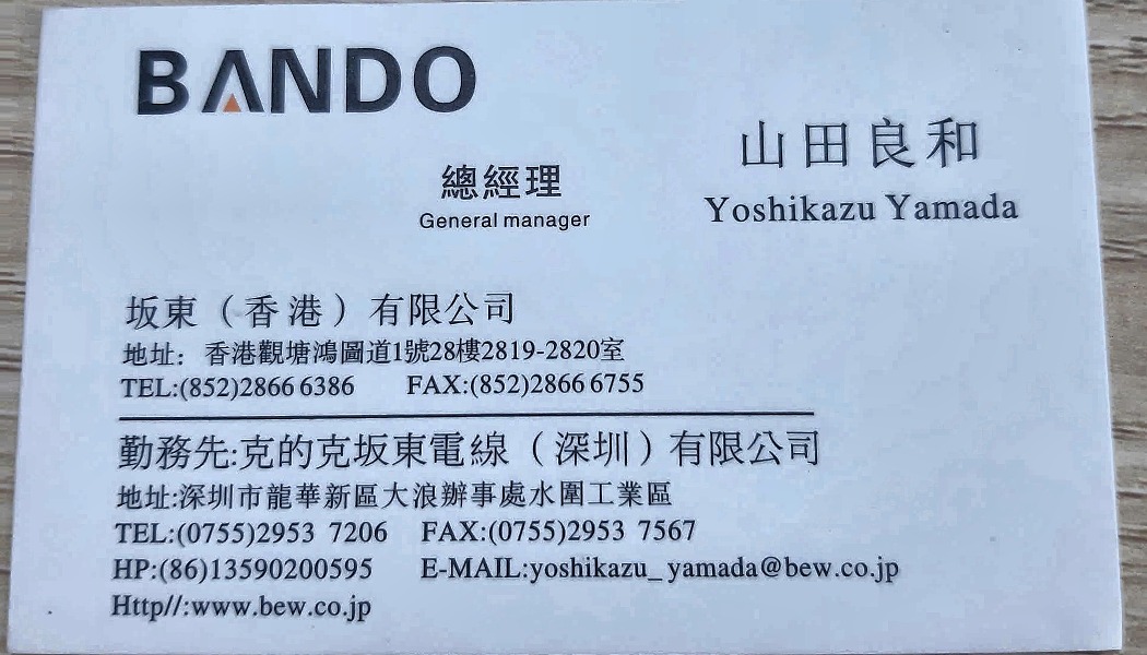 | 292 | Họ tên: Koichi Miyasaka Chức vụ: Công ty: 坂東電線株式会社 Email: k-miyasaka@bew.co.jp Số điện thoại: 0492806411 Website: http://www.bew.co.jp Mã số thuế: Địa chỉ: 埼玉県坂戸市千代田5-1-11, 〒350-0214, TEL 049-280-6411 | Hongkong / Business / Customer / Manufacturer | 2025-10-02 16:18:55 | Khách | |||