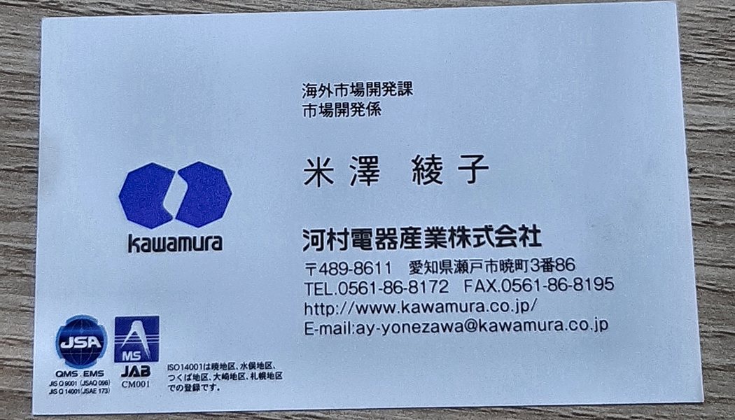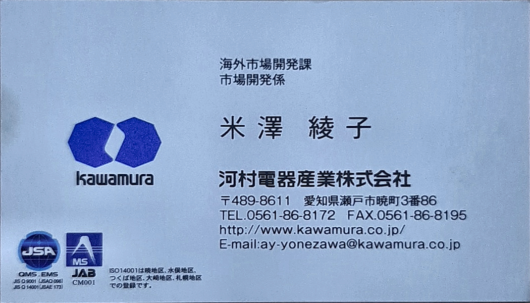 | 44 | Họ tên: 米澤綾子 Chức vụ: Công ty: 河村電器産業株式会社 Email: ay-yonezawa@kawamura.co.jp Số điện thoại: 0561868172 Website: http://www.kawamura.co.jp Mã số thuế: Địa chỉ: Công ty: 河村電器産業株式会社, ISO14001は暁地区、水俣地区、, つくば地区、大崎地区、札幌地区, での登録です。, 海外市場開発課, 市場開発係, 米澤綾子, 河村電器産業株式会社, 〒489-8611 愛知県瀬戸市暁町3番86 | USA | 2025-12-02 13:26:21 | Khách | |||