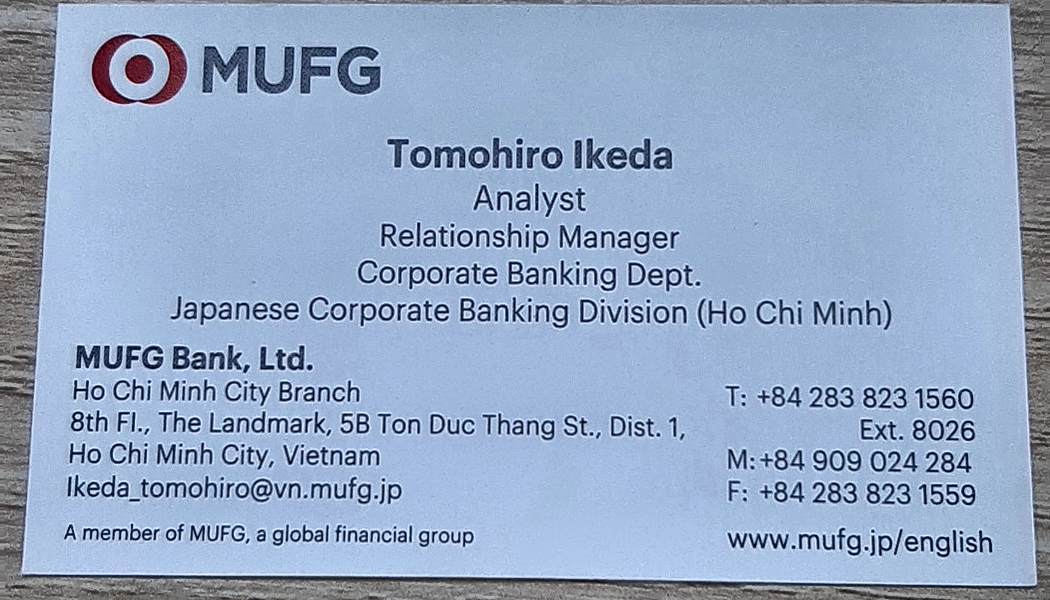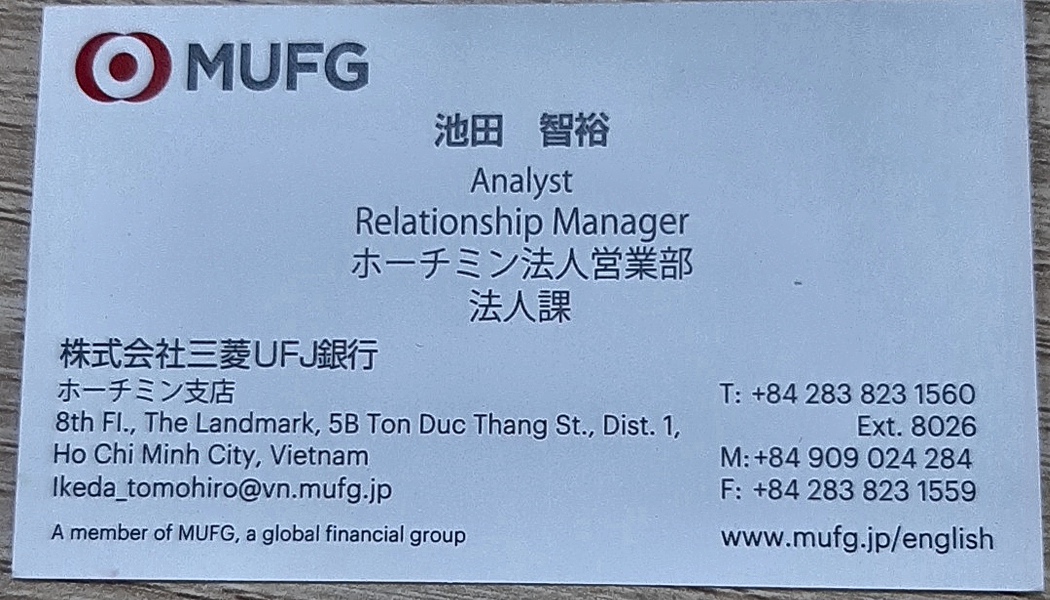 | 43 | Họ tên: Ho Chi Minh City Branch Chức vụ: Chức vụ: Relationship Manager Công ty: MUFG Bank, Ltd. Email: tomohiro@vn.mufg.jp Số điện thoại: +84909024284 Website: www.mufg.jp Mã số thuế: Địa chỉ: Họ tên: Ho Chi Minh City Branch, Ho Chi Minh City Branch, 8th Fl., The Landmark, 5B Ton Duc Thang St., Dist. 1,, Ho Chi Minh City, Vietnam | フィリピン | 2025-12-02 13:27:28 | Khách | |||