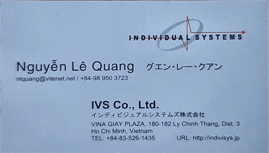 | 54 | Họ tên: : Chức vụ: Công ty: IVS Co., Email: nlquang@vitenet.net Số điện thoại: +84989503723 Website: http://indivisys.jp Mã số thuế: Địa chỉ: Ho Chi Minh, Vietnam, TEL: +84-83-526-1435, URL: http://indivisys.jp | Vietnam Nam | 2025-12-02 09:16:47 | Khách | |||