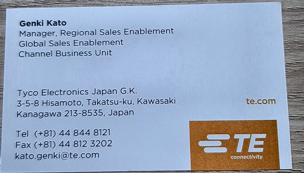 | 55 | Họ tên: Global Sales Enablement Chức vụ: Chức vụ: Manager, Regional Sales Enablement Công ty: TYCO Email: kato.genki@te.com Số điện thoại: Website: te.com Mã số thuế: Địa chỉ: | Japan | 2025-12-02 09:16:17 | Khách | |||