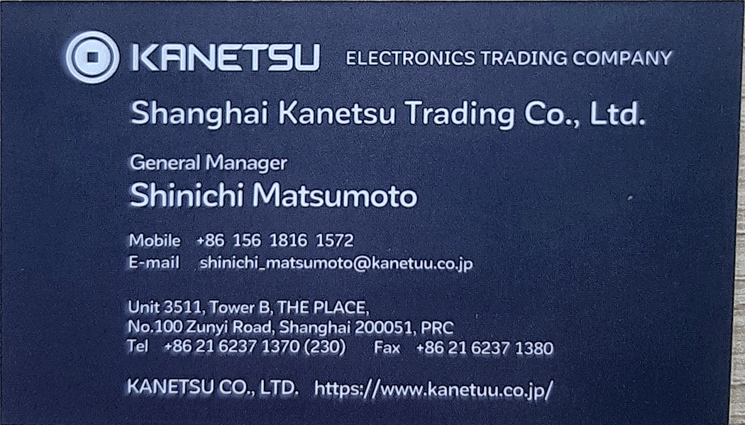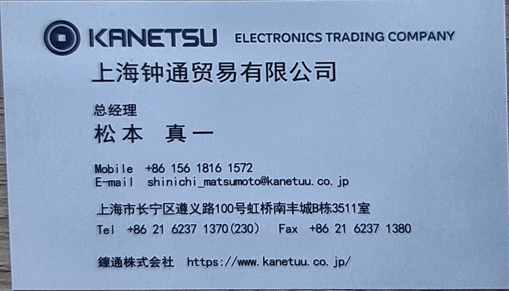 | 56 | Họ tên: Shinichi Matsumoto Chức vụ: Chức vụ: General Manager Công ty: KANETSU ELECTRONICS TRADING COMPANY Email: shinichi_matsumoto@kanetuu.co.jp Số điện thoại: Website: https://www.kanetuu.co.jp Mã số thuế: 8615618161572 Địa chỉ: No.100 Zunyi Road, Shanghai 200051, PRC | Hongkong | 2025-12-02 09:14:59 | Khách | |||