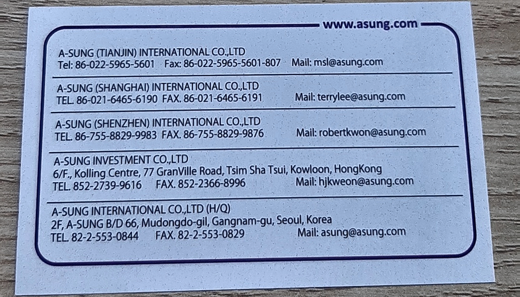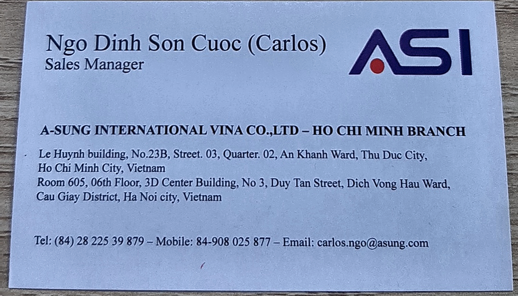 | 49 | Họ tên: : Chức vụ: Chức vụ: Sales Manager Công ty: A-SUNG INTERNATIONAL VINA CO.,LTD - HO CHI MINH BRANCH Email: carlos.ngo@asung.com Số điện thoại: Website: Mã số thuế: Địa chỉ: Le Huynh building, No.23B, Street. 03, Quarter. 02, An Khanh Ward, Thu Duc City,, Ho Chi Minh City, Vietnam, Room 605, 06th Floor, 3D Center Building, No 3, Duy Tan Street, Dich Vong Hau Ward,, Cau Giay District, Ha Noi city, Vietnam | フィリピン | 2025-12-02 09:33:37 | Khách | |||
