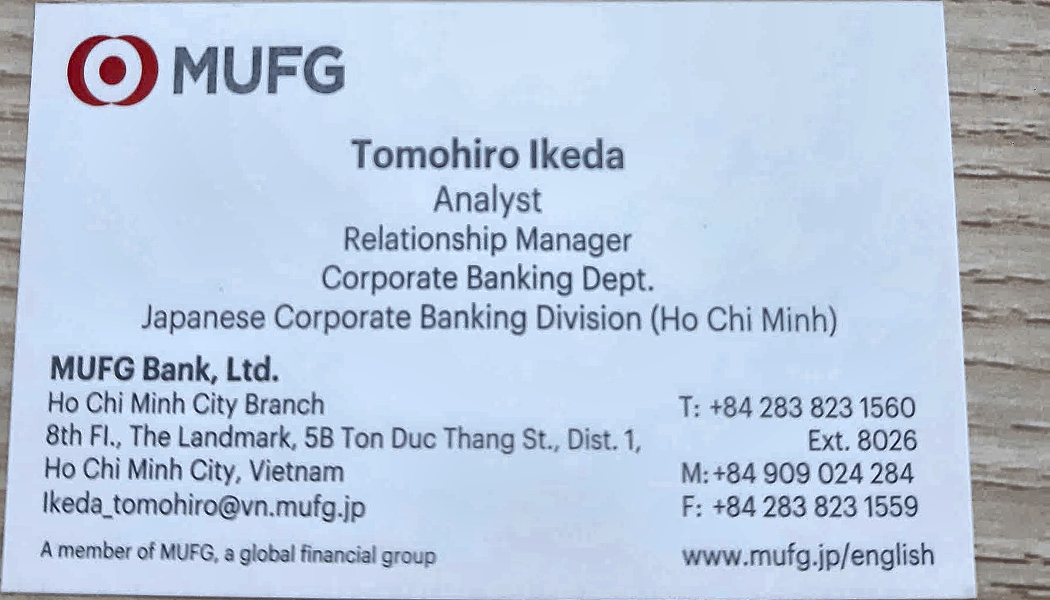 | 52 | Họ tên: Ho Chi Minh City Branch Chức vụ: Chức vụ: Relationship Manager Công ty: MUFG Bank, Ltd. Email: Ikeda_tomohiro@vn.mufg.jp Số điện thoại: +84909024284 Website: www.mufg.jp Mã số thuế: Địa chỉ: Họ tên: Ho Chi Minh City Branch, Ho Chi Minh City Branch, 8th Fl., The Landmark, 5B Ton Duc Thang St., Dist. 1,, Ho Chi Minh City, Vietnam | Thailand | 2025-12-02 09:18:50 | Khách | |||