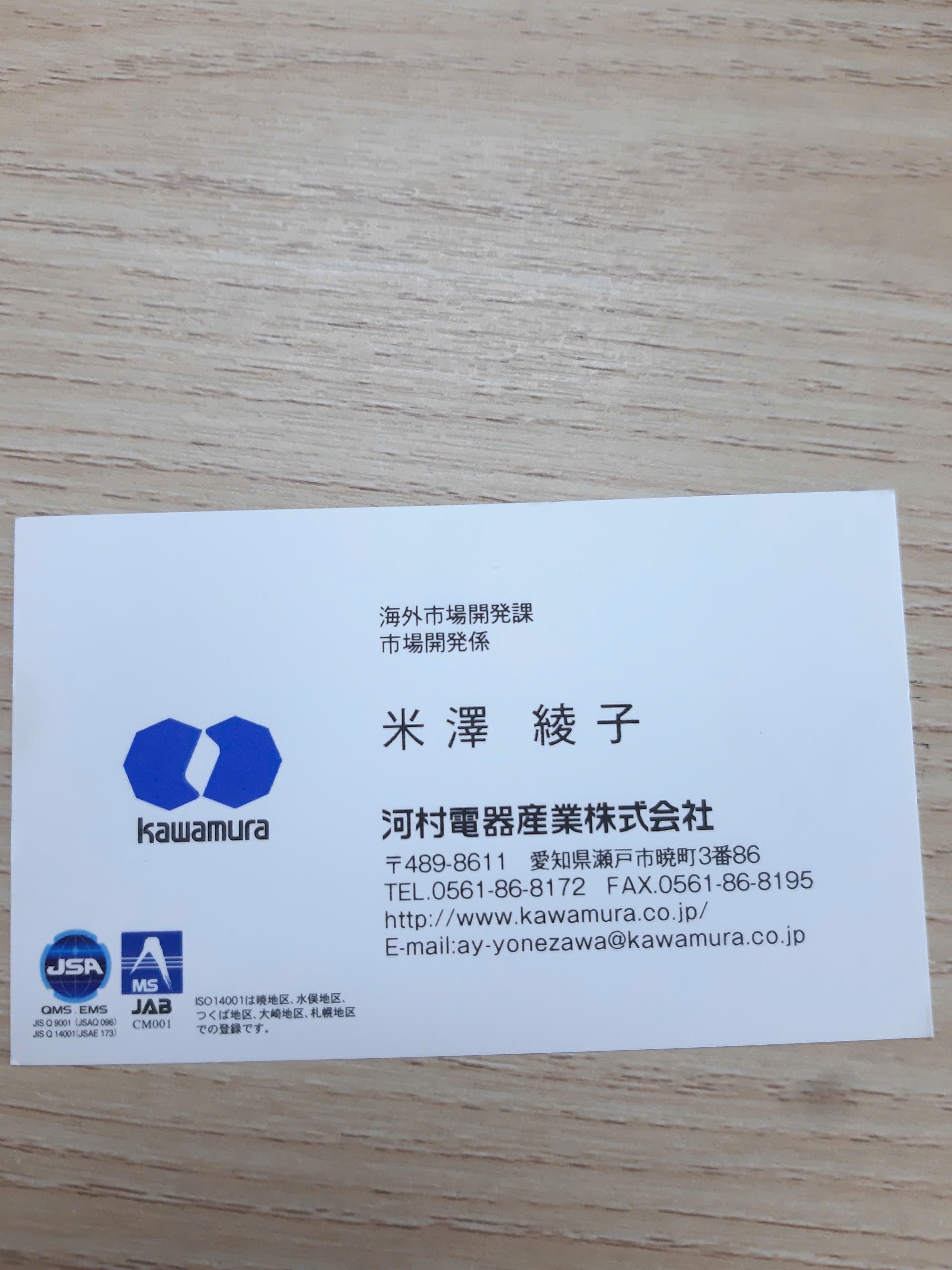 | 133 | ![]() | 👤 Họ tên: 米澤 綾子 🧑💼 Chức vụ: 🏢 Công ty: 河村電器産業株式会社 メールアドレス: ay-yonezawa@kawamura.co.jp 電話番号 0561868172 🌐 Website: http://www.kawamura.co.jp 納税者番号 📍 Địa chỉ: 🏢 Công ty: 河村電器産業株式会社, ISO14001は陸地区、水俣地区、, つくば地区、大崎地区、札幌地区, での登録です。, 海外市場開発課, 市場開発係, 米澤 綾子, 河村電器産業株式会社, 〒489-8611 愛知県瀬戸市暁町3番86 | Hongkong / Business | 2025-10-03 16:59:55 | Khách | ||