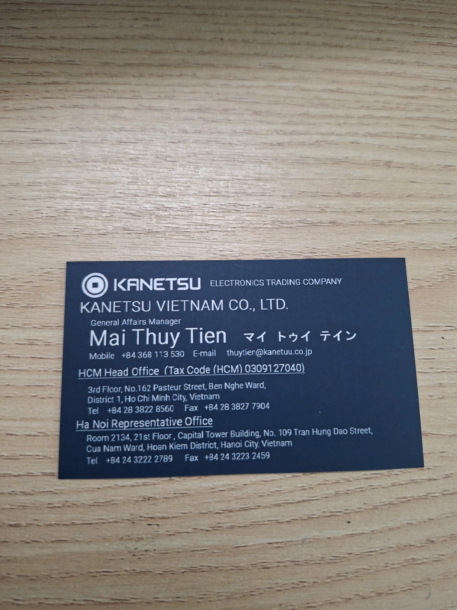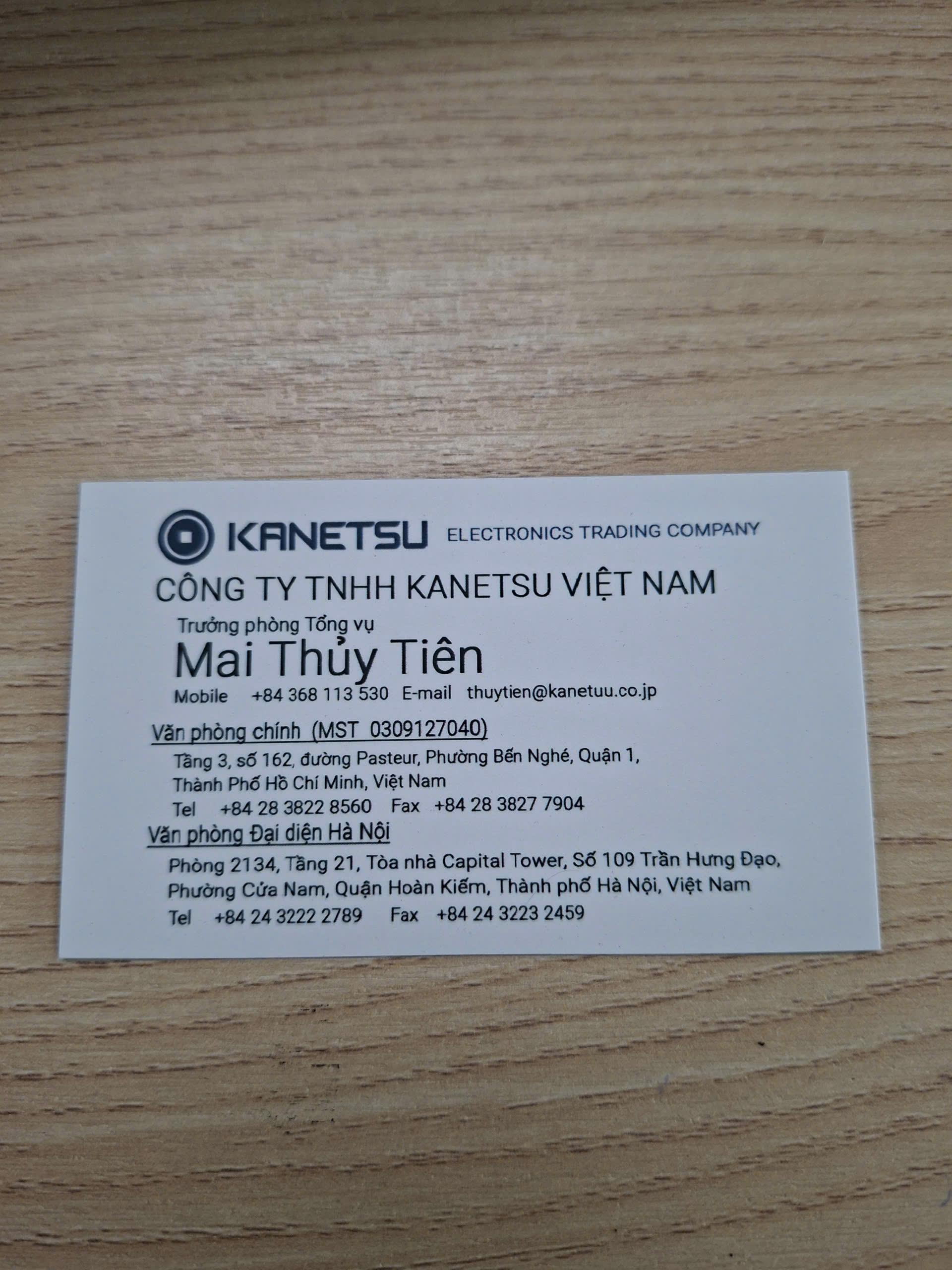 Địa chỉ: KANETSU VIETNAM CO., LTD., General Affairs Manager, Mai Thuy Tien マイ トゥイ テイン, (Tax Code (HCM) 0309127040), 3rd Floor, No.162 Pasteur Street, Ben Nghe Ward, District 1, Ho Chi Minh City, Vietnam, Ha Noi Representative Office, Room 2134, 21st Floor, Capital Tower Building, No. 109 Tran Hung Dao Street, Cua Nam Ward, Hoan Kiem District, Hanoi City, Vietnam