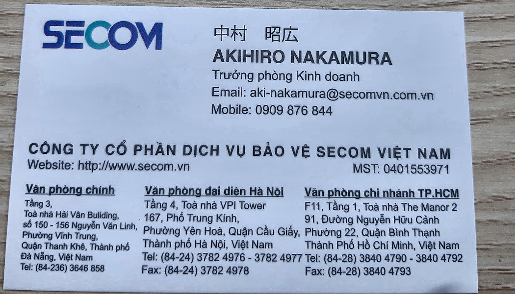 | 5 | Họ tên: 中村 昭広 Chức vụ: Chức vụ: Trưởng phòng Kinh doanh Công ty: CÔNG TY CỔ PHẦN DỊCH VỤ BẢO VỆ SECOM VIỆT NAM Email: aki-nakamura@secomvn.com.vn Số điện thoại: 0909876844 Website: http://www.secom.vn Mã số thuế: 0401553971 Địa chỉ: Họ tên: 中村 昭広, 中村 昭広, AKIHIRO NAKAMURA, Trưởng phòng Kinh doanh, Quận Thanh Khê, Thành phố, Đà Nẵng, Việt Nam, Tel: (84-236) 3646 858, Phường Vĩnh Trung,, Văn phòng đại diện Hà Nội, Tầng 4, Toà nhà VPI Tower, 167, Phố Trung Kính,, Phường Yên Hoà, Quận Cầu Giấy,, Thành phố Hà Nội, Việt Nam, Văn phòng chi nhánh TP.HCM, F11, Tầng 1, Toà nhà The Manor 2, 91, Đường Nguyễn Hữu Cảnh, Phường 22, Quận Bình Thạnh, Thành Phố Hồ Chí Minh, Việt Nam, Tel: (84-24) 3782 4976-3782 4977 Tel: (84-28) 3840 4790 - 3840 4792 | Hongkong / Business | 2025-12-04 10:08:24 | Test Test | |||