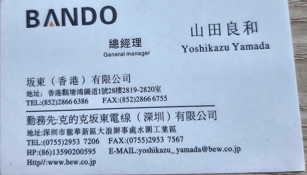 | 3 | Họ tên: Yoshikazu Yamada Chức vụ: Chức vụ: General manager Công ty: 深圳市龍華新區大浪辦事處水圍工業區 Email: yoshikazu_yamada@bew.co.jp Số điện thoại: Website: www.bew.co.jp Mã số thuế: 13590200595 Địa chỉ: Công ty: 深圳市龍華新區大浪辦事處水圍工業區, 地址:香港觀塘鴻圖道1號28樓2819-2820室, TEL:(852)28666386, 地址:深圳市龍華新區大浪辦事處水圍工業區 | Hongkong / Business | 2025-12-17 11:32:57 | Test Test | |||